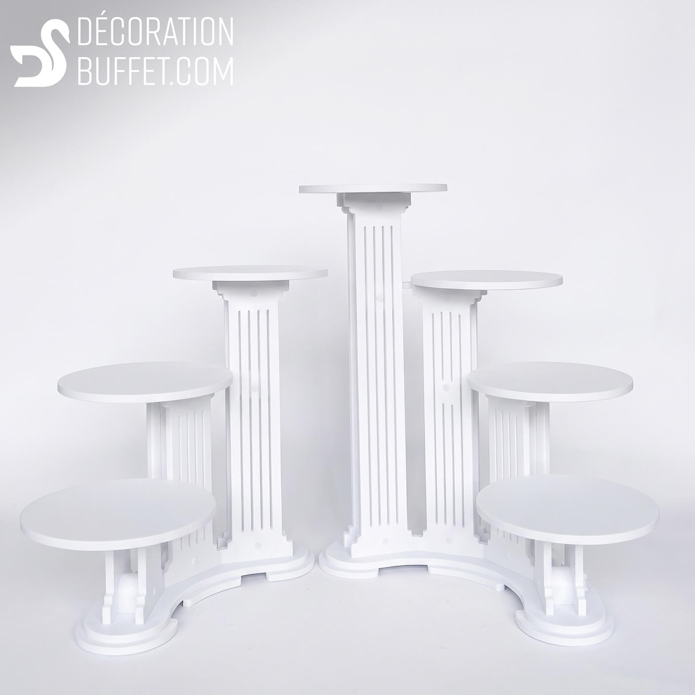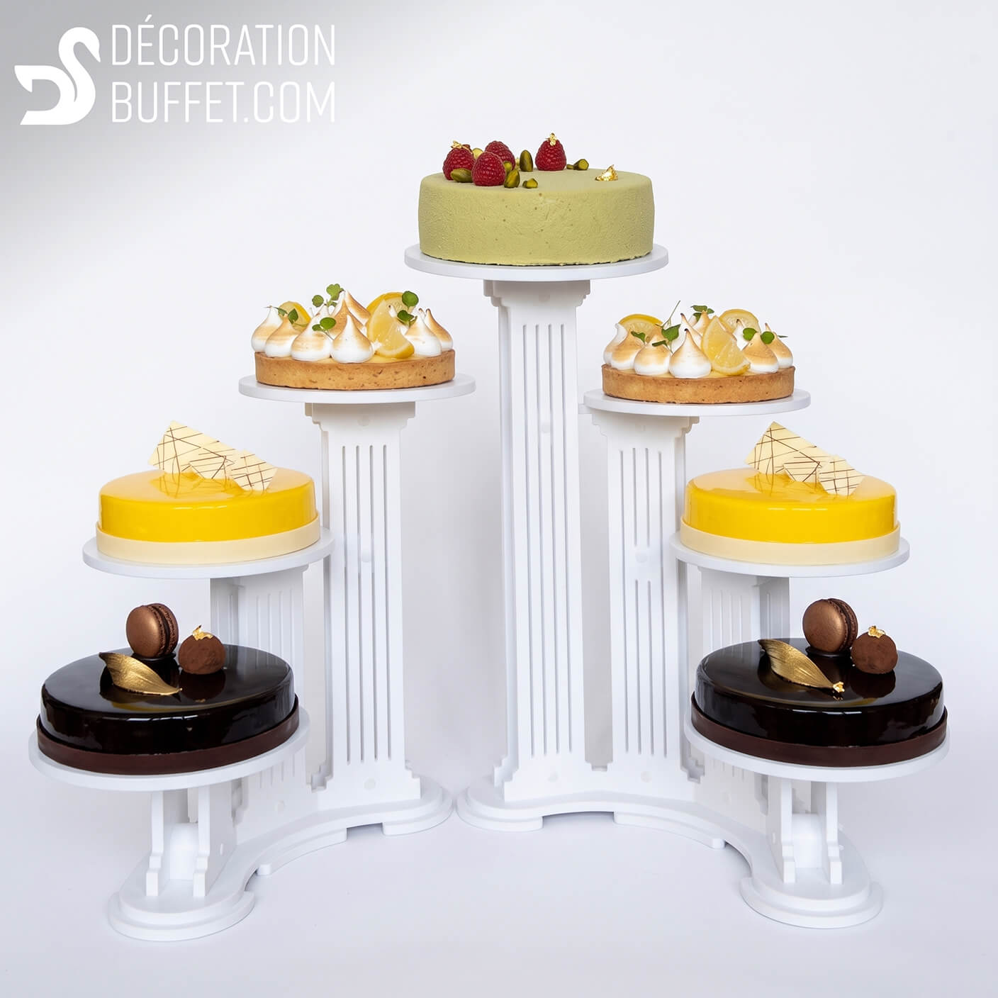 Cette version moderne et sobre de colonnades antiques donne à la présentation des pâtisseries un style valorisant. La forme courbe de chacun des socles permet de former un ensemble en les disposant tête bêche. Leur taille facilite les déplacements et le stockage.